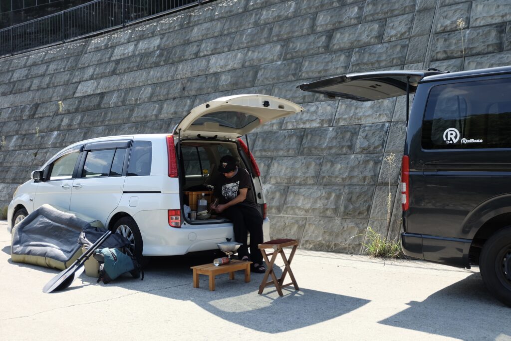 お互いに車中泊。