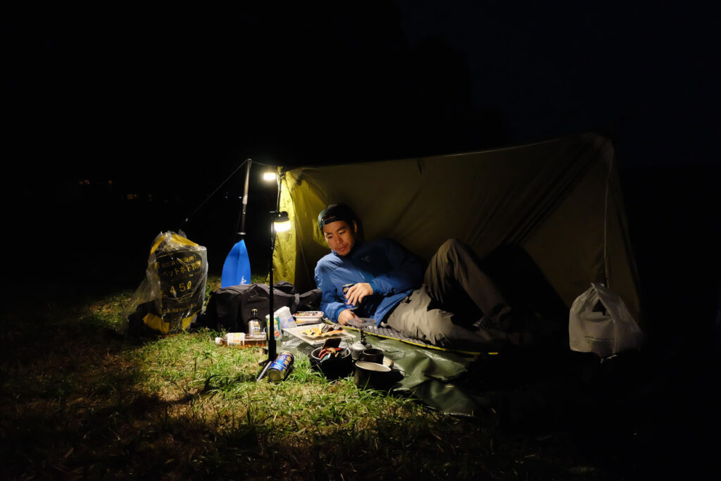 夜中にポツポツと小雨が降り始めたので、カメラの三脚を使って慌てて屋根を拵えた。