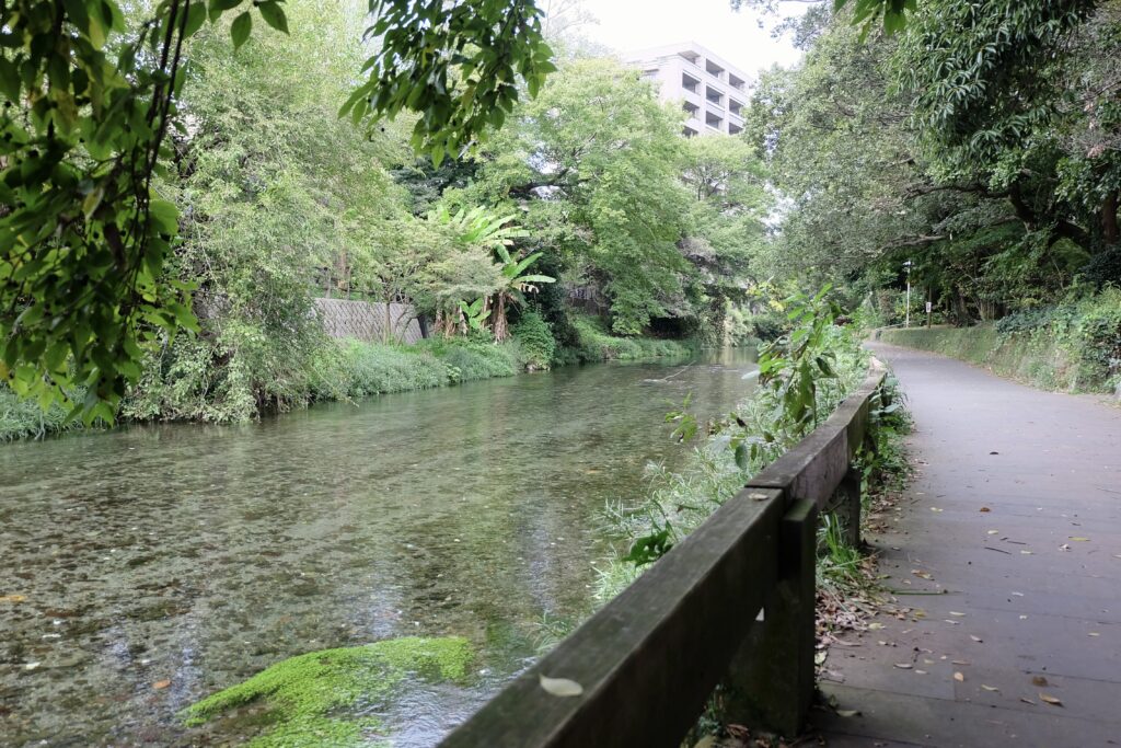 水前寺成趣園を出て、加勢川沿いを江津湖方面へ歩いていく。